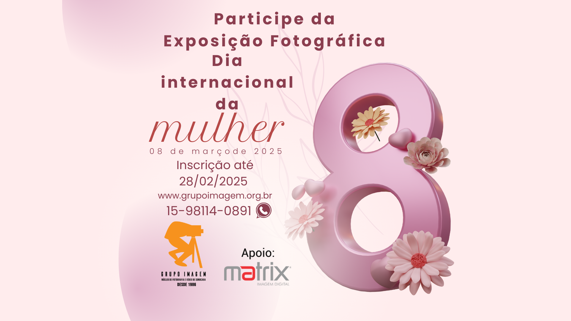 O Grupo Imagem Núcleo de Fotografia e Vídeo de Sorocaba tem o prazer de convidar fotógrafos e entusiastas da fotografia para participarem da Exposição Fotográfica em homenagem ao Dia Internacional da Mulher. O evento visa destacar e celebrar a importância das mulheres através da arte fotográfica.