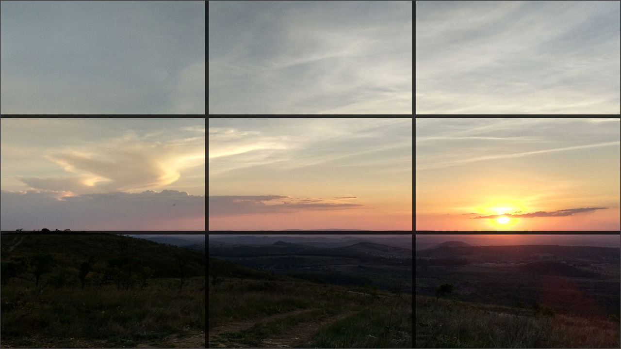 - Regra dos Terços: Dividir a tela em nove quadrantes ajuda a posicionar o sujeito nos pontos de interseção, criando equilíbrio.