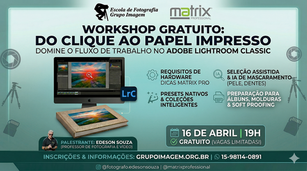 Garantir uma edição rápida e uma impressão fiel ao que vês no monitor não é fruto do acaso, mas sim de um fluxo de trabalho bem estruturado. O Grupo Imagem, em parceria com a Matrix Professional, convida-te para um workshop prático e transformador com o fotógrafo Edeson Souza.